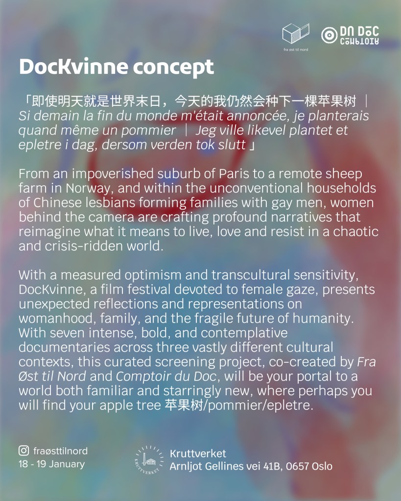 With a measured optimism and transcultural sensitivity, DocKvinne, a film festival devoted to female gaze, presents unexpected reflections and representations on womanhood, family, and the fragile future of humanity. With seven intense, bold, and contemplative documentaries across three vastly different cultural contexts, this curated screening project, co-created by Fra Øst til Nord and Comptoir du Doc, will be your portal to a world both familiar and starringly new, where perhaps you will find your apple tree 苹果树/pommier/epletre.